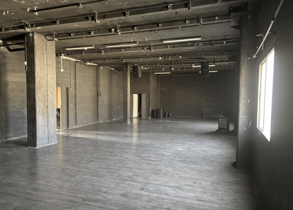 The Black Box Space – 18×9 meters with two pillars, fully black, professional dance floor with parquet.